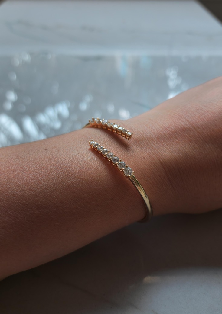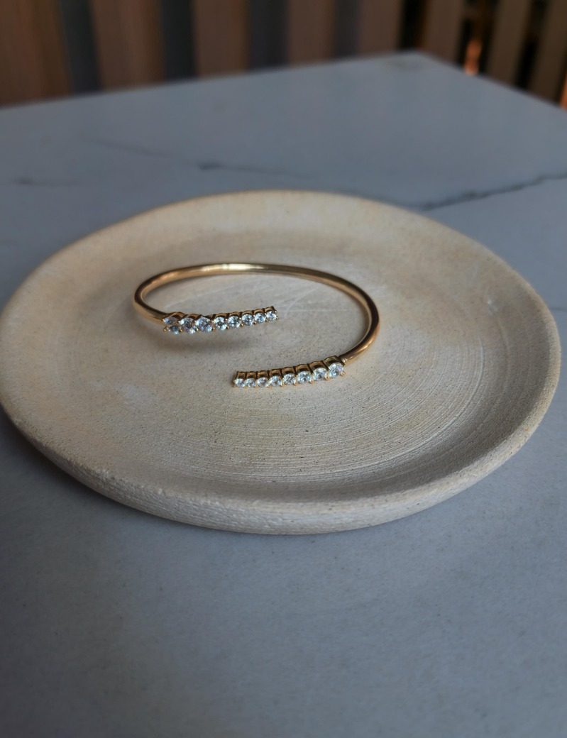 Bracelete maleável em prata 925 + ouro 18kts. Puro luxo e sofisticação! Possui cravação em zircônias premium