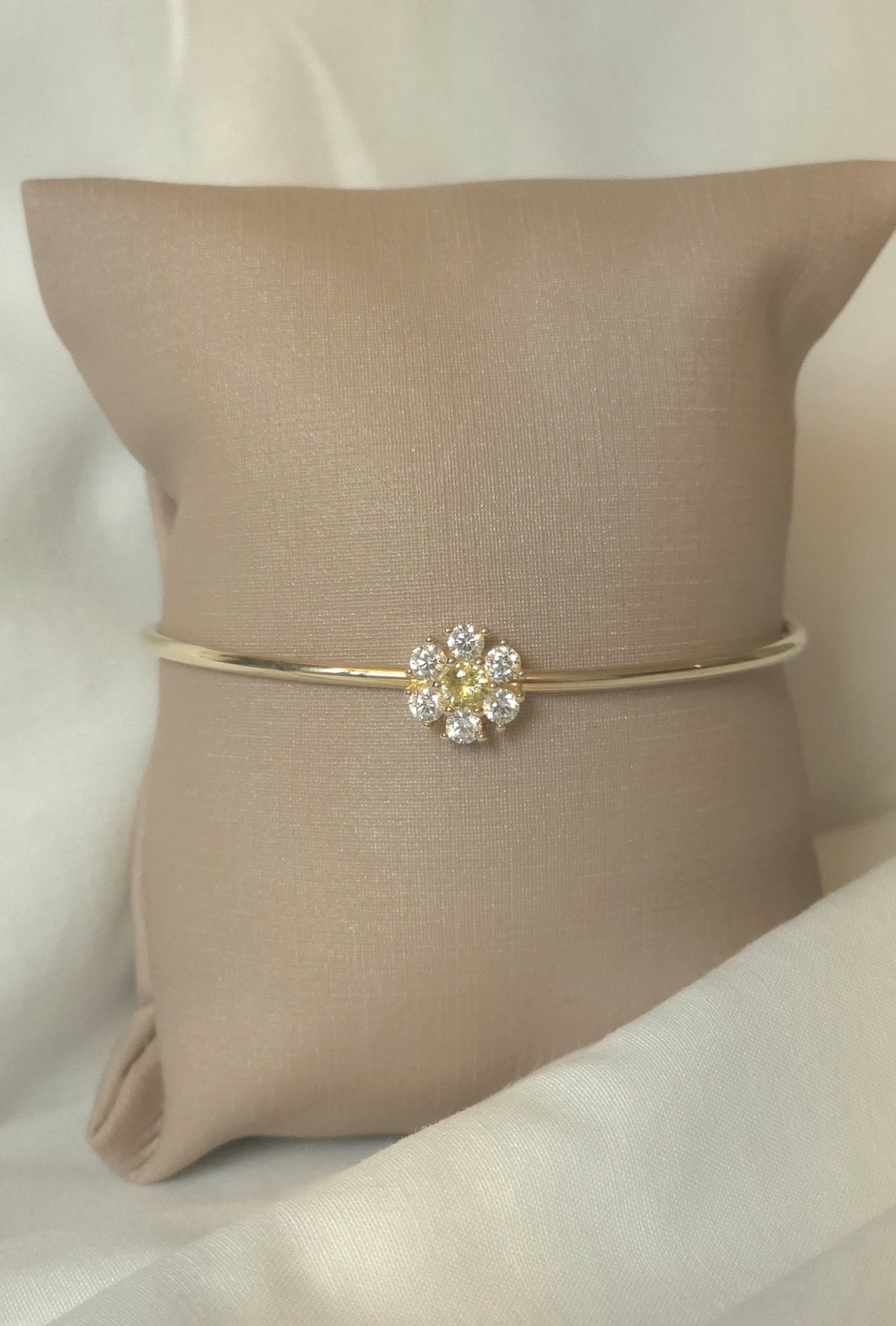 Uma joia que traduz feminilidade, delicadeza e brilho em cada detalhe. Feita em prata 925 com banho de ouro 18k, esta pulseira rígida e minimalista ganha protagonismo com uma charmosa flor central, formada por zircônias que irradiam luz e refinamento. O centro levemente dourado traz um toque de calor e sofisticação, criando um contraste suave e elegante com o brilho cristalino ao redor.