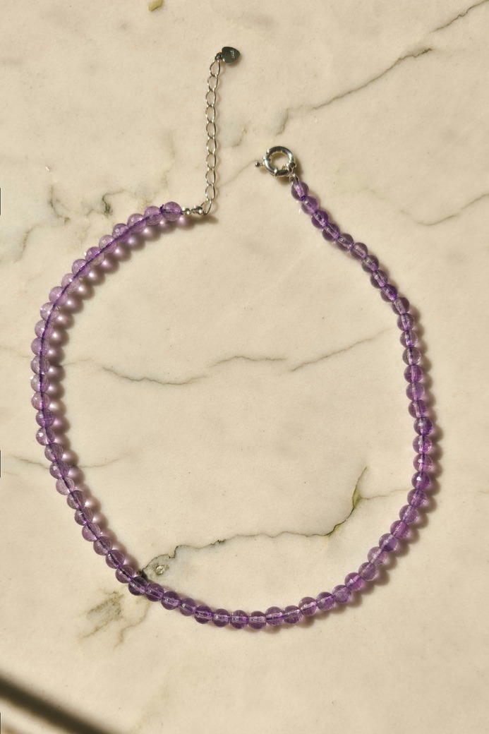 Delicado e elegante, este colar é composto por pedras naturais de ametista lapidadas em formato oval facetado, que refletem a luz com suavidade e brilho discreto. A ametista é conhecida por sua beleza singular e por carregar significados ligados à proteção, equilíbrio emocional e elevação espiritual.