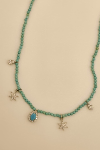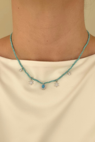 Um colar que une a energia vibrante da turquesa natural com o brilho delicado das zircônias e a sofisticação da prata 925. Os pingentes em forma de estrelas e gotas trazem um charme especial, criando um design leve e encantador ,perfeito para quem ama acessórios com personalidade e simbolismo.