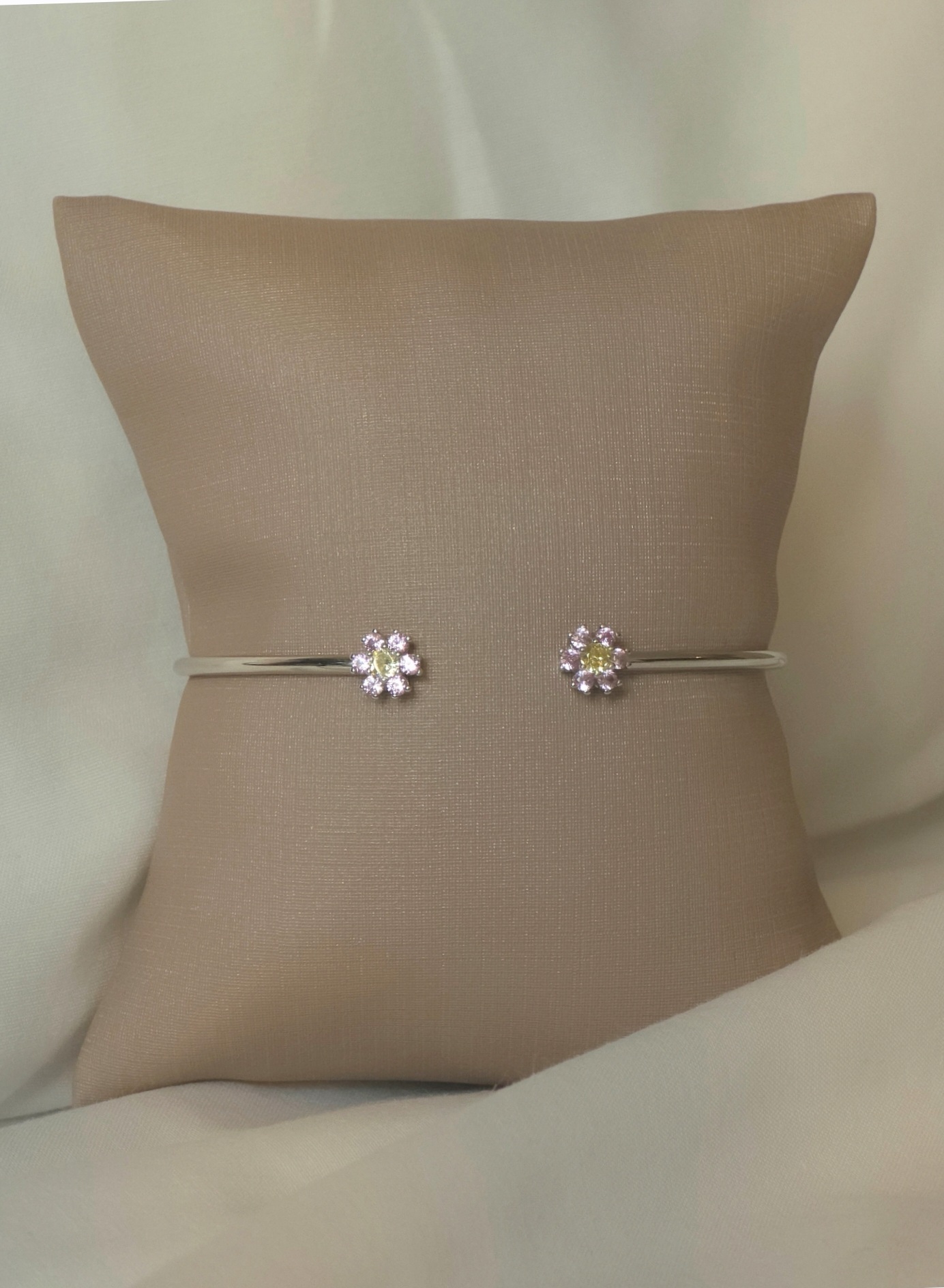 Uma peça que traduz romantismo, delicadeza e poesia em forma de joia. Este bracelete em prata 925 traz um design aberto e minimalista, finalizado com duas flores delicadamente cravejadas com zircônias rosa, que iluminam com um brilho suave, feminino e encantador.