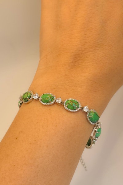 Uma joia que traduz sofisticação e autenticidade. Confeccionada em prata 925, esta pulseira é composta por elos de pedras naturais verdes em lapidação oval, cada uma cercada por micro zircônias que realçam sua intensidade única. Entre cada pedra, delicadas zircônias maiores iluminam a peça, criando um contraste harmonioso entre o brilho e a força da natureza.